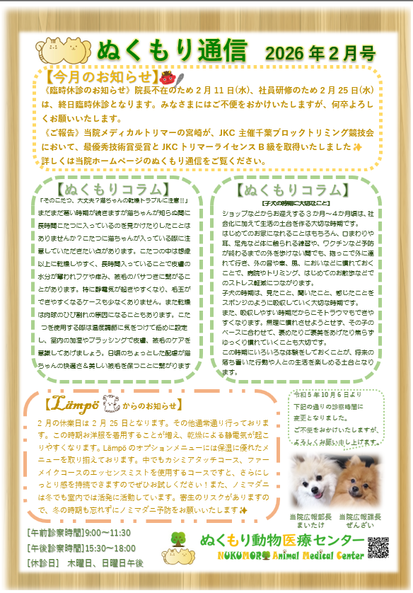 2月の休業日は2月25日となります。その他通常通り行っております。この時期お洋服を着用することが増え、乾燥による静電気が起こりやすくなります。Lämpöのオプションメニューには保湿に優れたメニューを取り揃えております。中でもカシミアタッチコース、ファーメイクコースのエッセンスミストを使用するコースですと、さらにしっとり感を持続できますのでぜひお試しください!また、ノミマダニは冬でも室内では活発に活動しています。寄生のリスクがありますので、冬の時期も忘れずにノミマダニ予防をお願いいたします✨