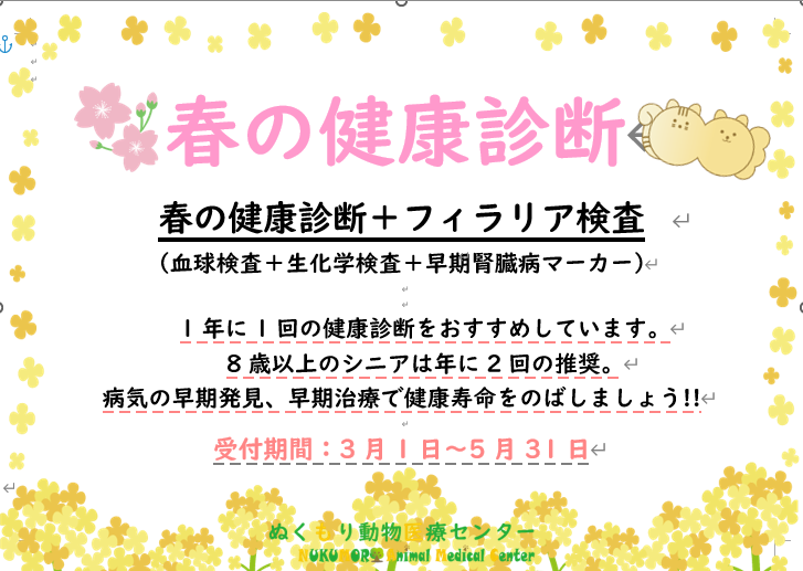 当院での春の健康診断にはフィラリアの検査も含まれていまので、この機会にぜひご利用ください。