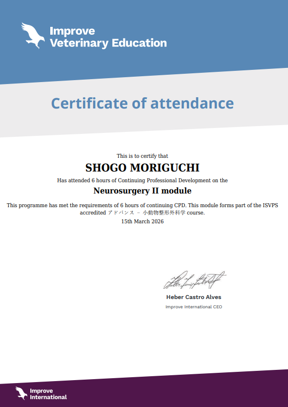これらの手術は当院でもMRI撮影後に既に実施しておりますが、今回得た知識と技術を活かし、より正確で安全な手術の実施と動物たちの早期回復を目指して、さらに診療の質の向上に努めてまいります。